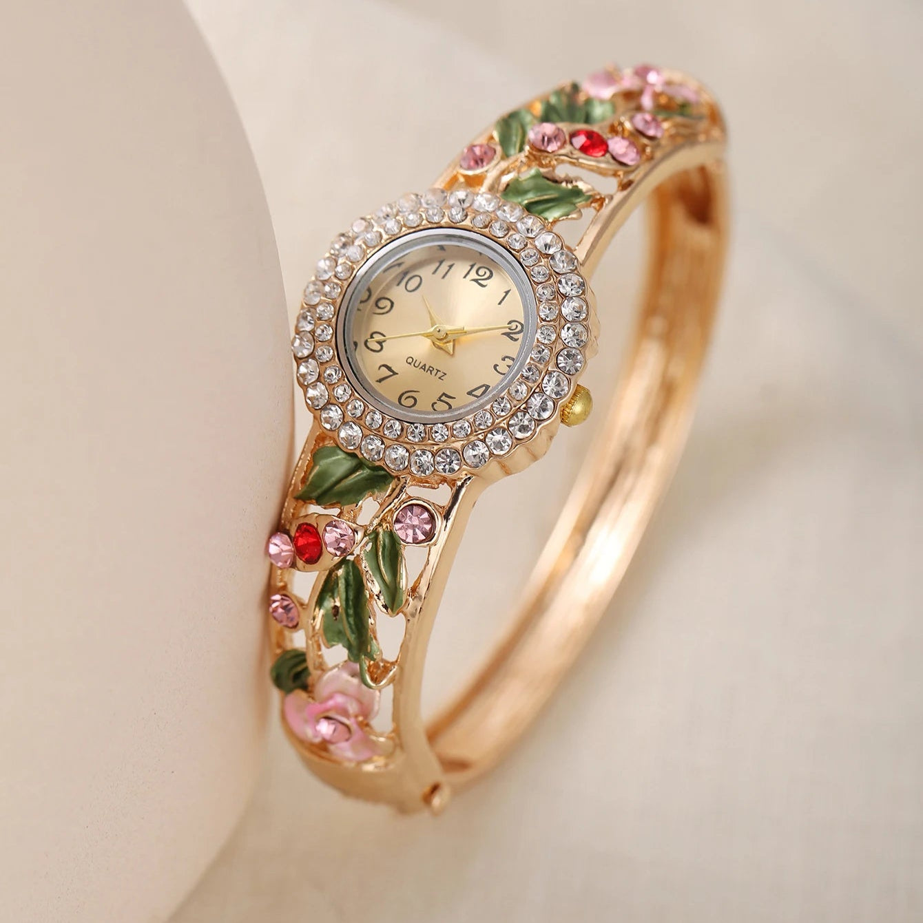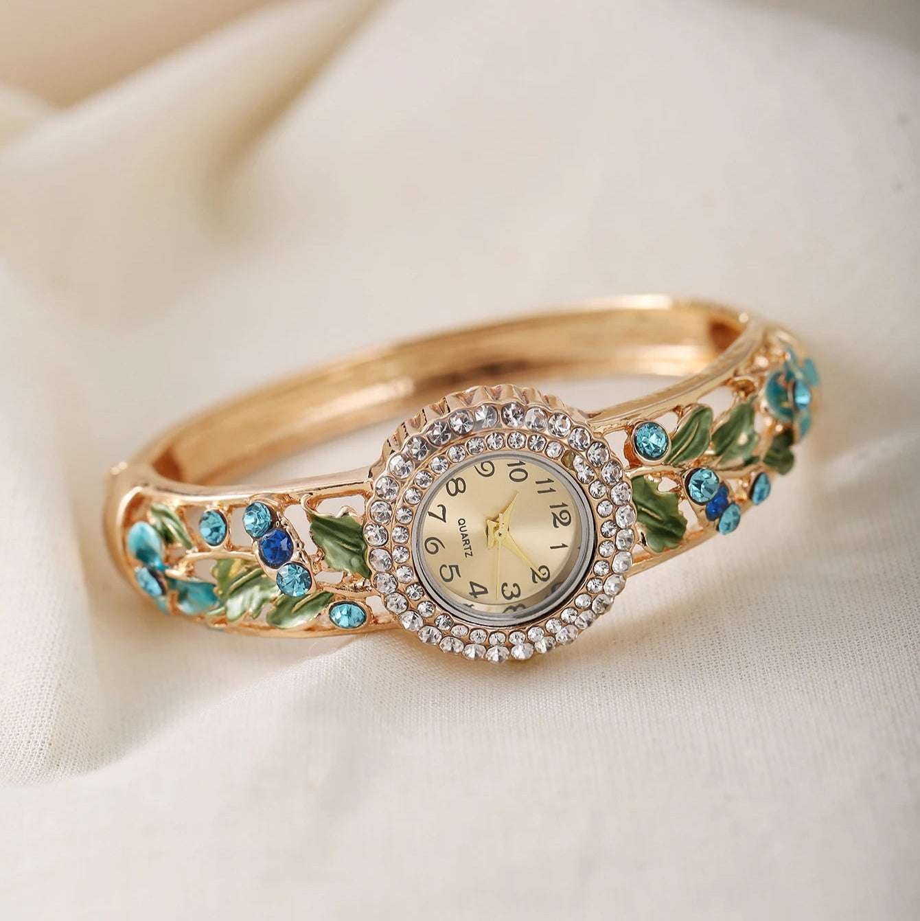 A true statement of feminine elegance, this quartz watch features a delicate floral design accented with shimmering stones and a sparkling diamond bezel. Romantic and refined, it’s the perfect accessory to add a touch of charm and grace to any outfit.